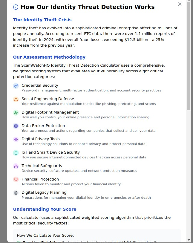The assessment methodology is developed by identity theft protection specialists who understand both the criminal techniques used in modern identity theft and the practical realities of personal security implementation.